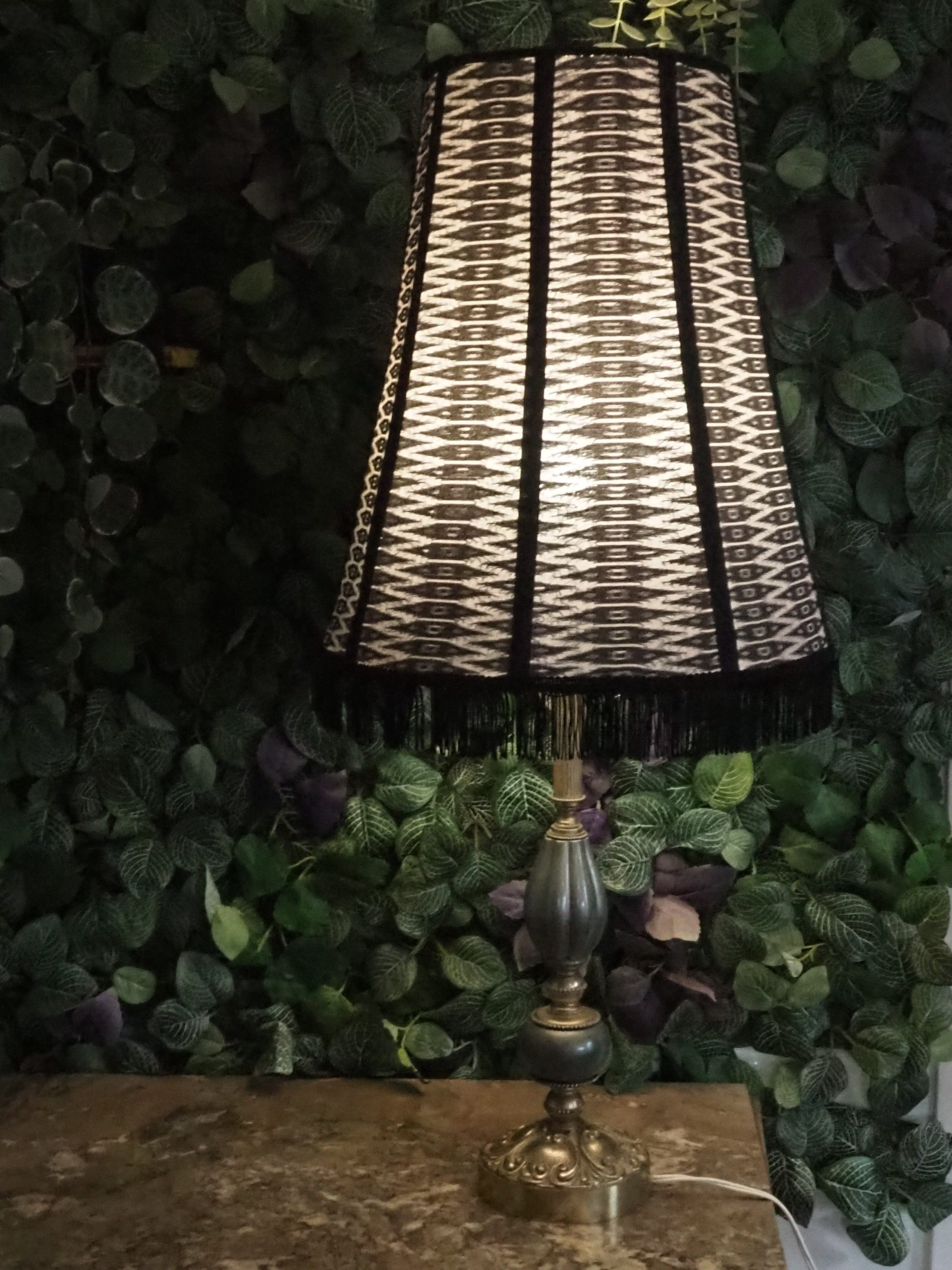 Abat-jour en tissu tendu, tissu indien et galon/franges pour les finitions