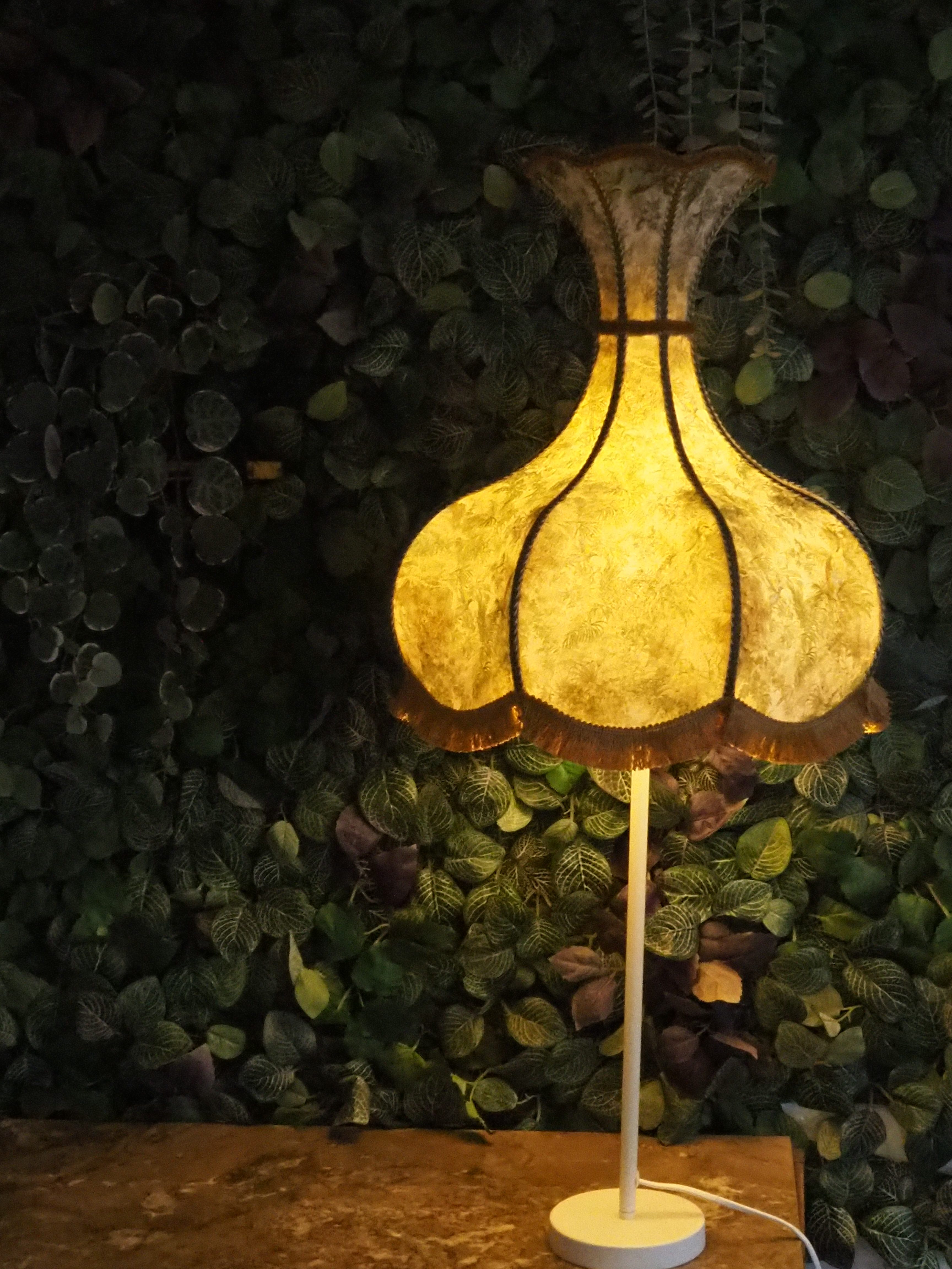 Abat-jour en tissu tendu, forme atypique, en tissu français avec finitions galon et franges.